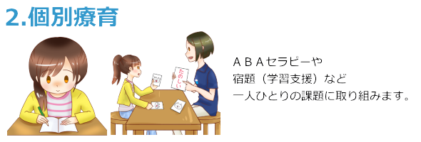 ABAとは、応用行動分析おいう心理学の「学習の理論」に基づいた科学的なエビデンスのある療育方法です。「行動のあとの結果によって行動は増減する」という基本原理に則り、望ましい行動を増やし、望ましくない行動を減らす働きかけをします。